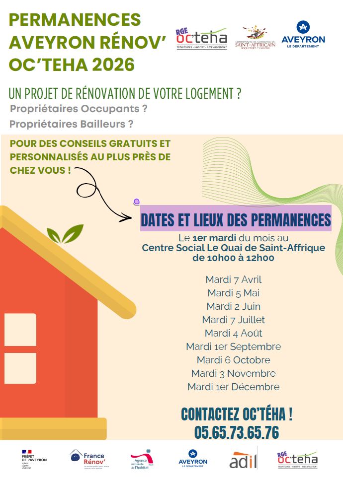 A compter du jeudi 16 avril 2026, les permanences d’information sur l’habitat et les aides possibles en cas de travaux, se feront sans rendez-vous au centre social LE QUAI de Saint-Affrique le jeudi de 9h00 à 12h00